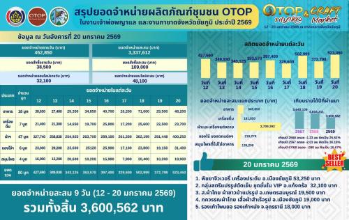 1.นำเสนอสรุปผลการจัดแสดงและจำหน่ายผลิตภัณฑ์ชุมชน OTOP พญาแล & Craft Market ในงานเจ้าพ่อพญาแล และงานกาชาดจังหวัดชัยภูมิ ประจำปี 2569 ระหว่างวันที่ 12 - 20 มกราคม 2569 โดยมียอดจำหน่ายผลิตภัณฑ์ชุมชน OTOP รวมทั้งสิ้น 3,600,562 บาท